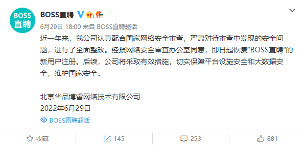 6月29日,BOSS直聘背后公司北京华品博睿网络技术有限公司发布公告称,近一年来,我公司认真配合国家网络安全审查,严肃对待审查中发现的安全问题,进行了全面整改。经报网络安全审查办公室同意,即日起恢复“BOSS直聘”的新用户注册。后续,公司将采取有效措施,切实保障平台设施安全和大数据安全,维护国家安全。